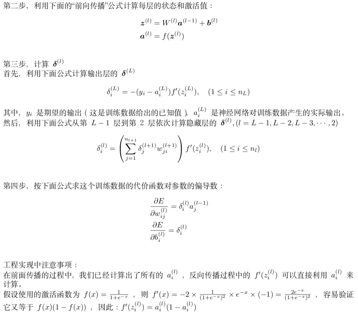 误差反向传播算法简称反向传播算法(即BP算法)。使用反向传播算法的多层感知器又称为BP神经网络。BP算法是一个迭代算法,它的基本思想为:(1)先计算每一层的状态和激活值,直到最后一层(即信号是前向传播的);(2)计算每一层的误差,误差的计算过程是从最后一层向前推进的(这就是反向传播算法名字的由来);(3)更新参数(目标是误差变小)。迭代前面两个步骤,直到满足停止准则(比如相邻两次迭代的误差的差别很小)。